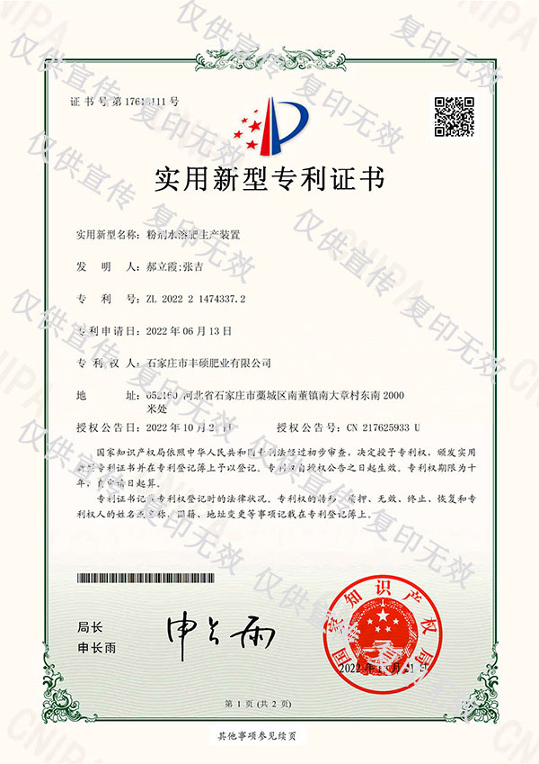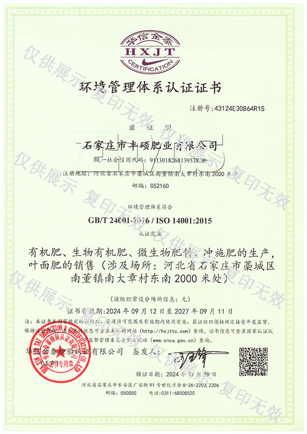 石家莊市豐碩肥業(yè)有限公司是一家集新型肥料的研發(fā)、制造、營銷、服務于一體的高新技術企業(yè),公司自2008年創(chuàng)辦以來,一直致力于新型肥料的技術研發(fā)和市場推廣。公司組建了豐碩新型肥料研究中心(院士專家企業(yè)工作站),自主知識產權研發(fā)團隊專業(yè)科研人員20余人,獲得了多項肥料國家發(fā)明專利。公司目前已擁有發(fā)酵類有機肥、微生物菌劑、生物有機肥、土壤調理劑、大量元素水溶肥、含腐植酸肥料、含氨基酸肥料、中微量元素肥料等8大品類,“金維克”、“豐碩沃農”等2大自有品牌,擁有20多個暢銷品種。目前,我公司已經通過了“ISO9001 質量管理體系認證”、“ISO14001 環(huán)境管理體系認證”、“OHSAS18001 職業(yè)健康管理體系認證”。...